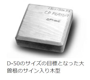 ”「これでCDプレーヤーをやってみてくれ」と、ゼネラルオーディオ事業部長の大曽根幸三(おおそね こうぞう)は、13.4cm四方の正方形で厚さが約4cm、CDソフトのジャケット4枚分の厚さの木型(木片を加工したもの)を部下に示した。「中にバッタを入れようがセミを入れようが構わない。とにかく音が出るようにしてくれ」。大曽根の言葉に、居合わせた皆は思わず笑ってしまった。”