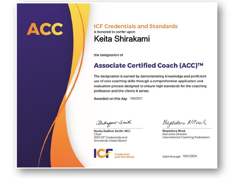 弊社代表 白神敬太が国際コーチング連盟アソシエイト認定コーチ(ICF-ACC)を取得しました